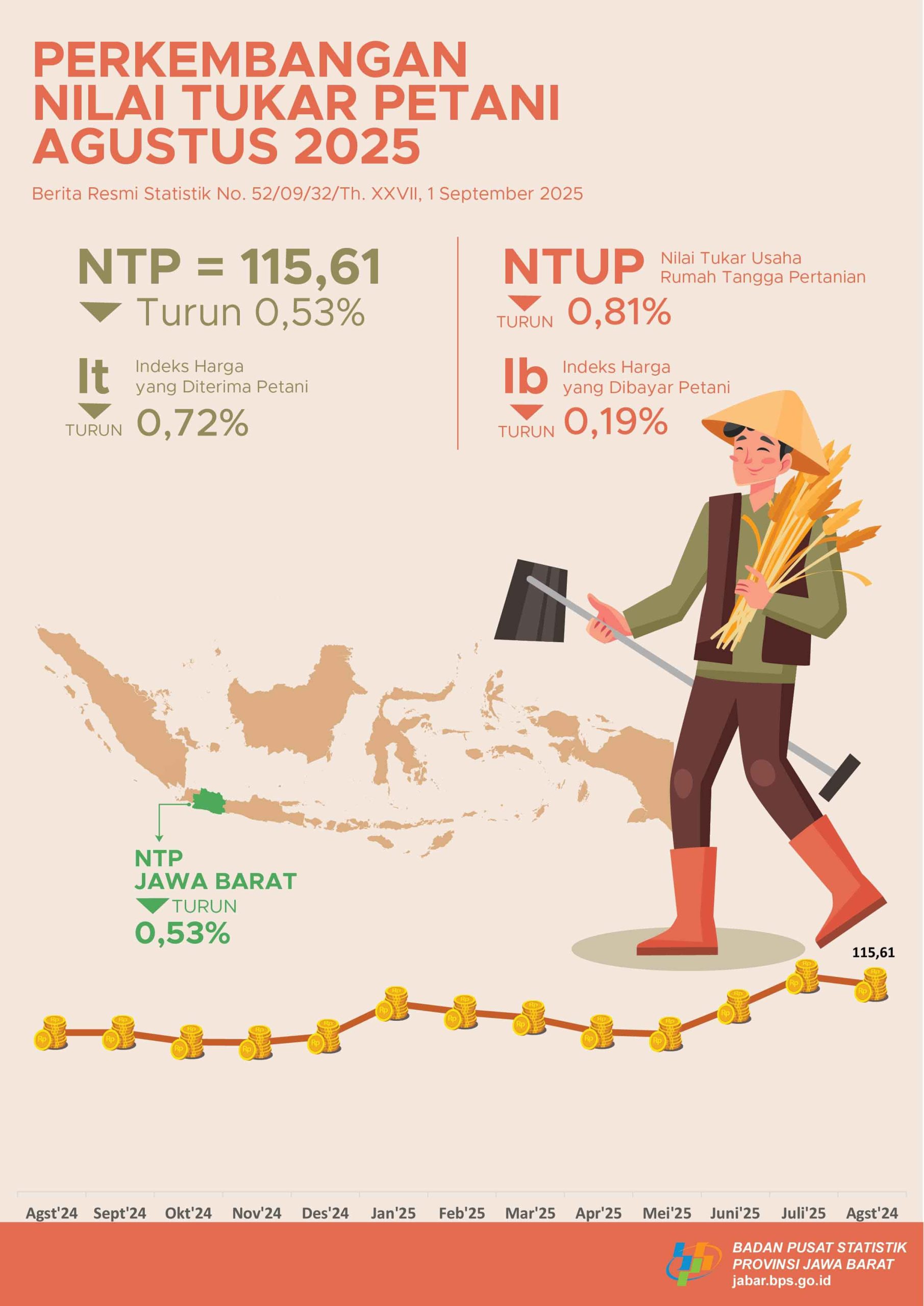 Nilai Tukar Usaha Rumah Tangga Pertanian (NTUP) Jawa Barat pada bulan Agustus 2025 turun sebesar 0,81 persen, sementara Indeks Biaya Produksi dan Penambahan Barang Modal (BPPBM) naik sebesar 0,09 persen.(jabar.bps.go.id)