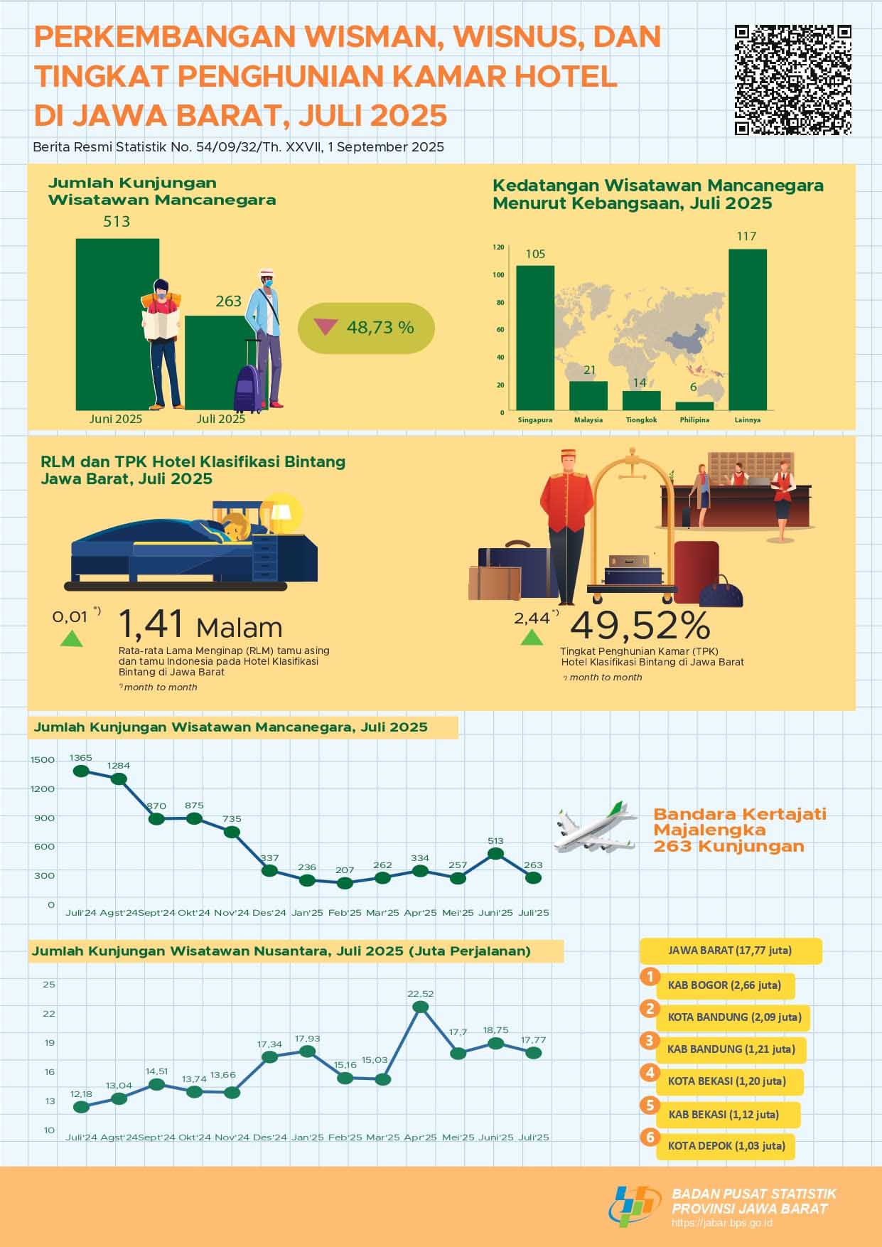 Rata-rata lama menginap tamu asing Juli 2025 tercatat 2,58 malam dan tamu Indonesia selama 1,29 malam.(jabar.bps.go.id)