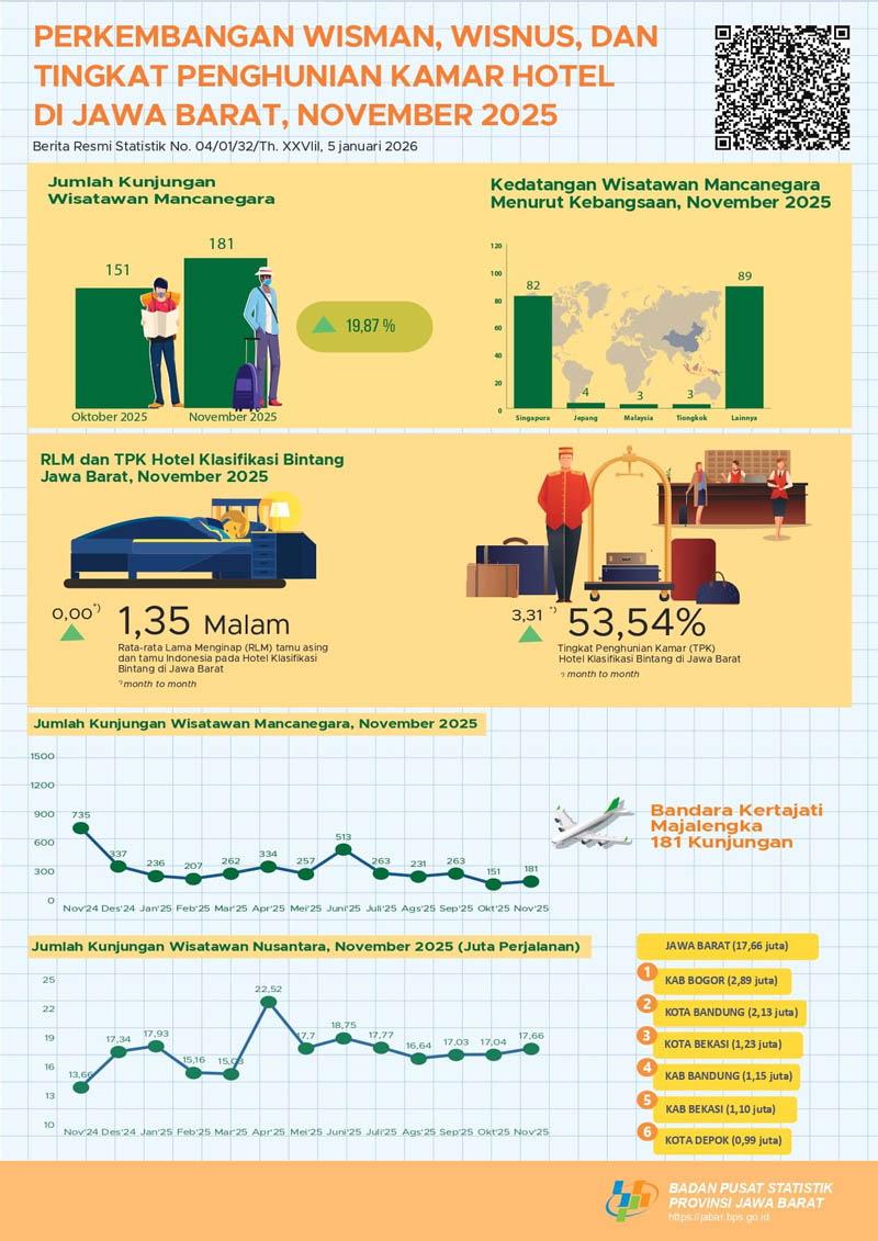 Rata-rata lama menginap tamu asing November 2025 tercatat 2,56 malam dan tamu Indonesia selama 1,32 malam.(jabar.bps.go.id)